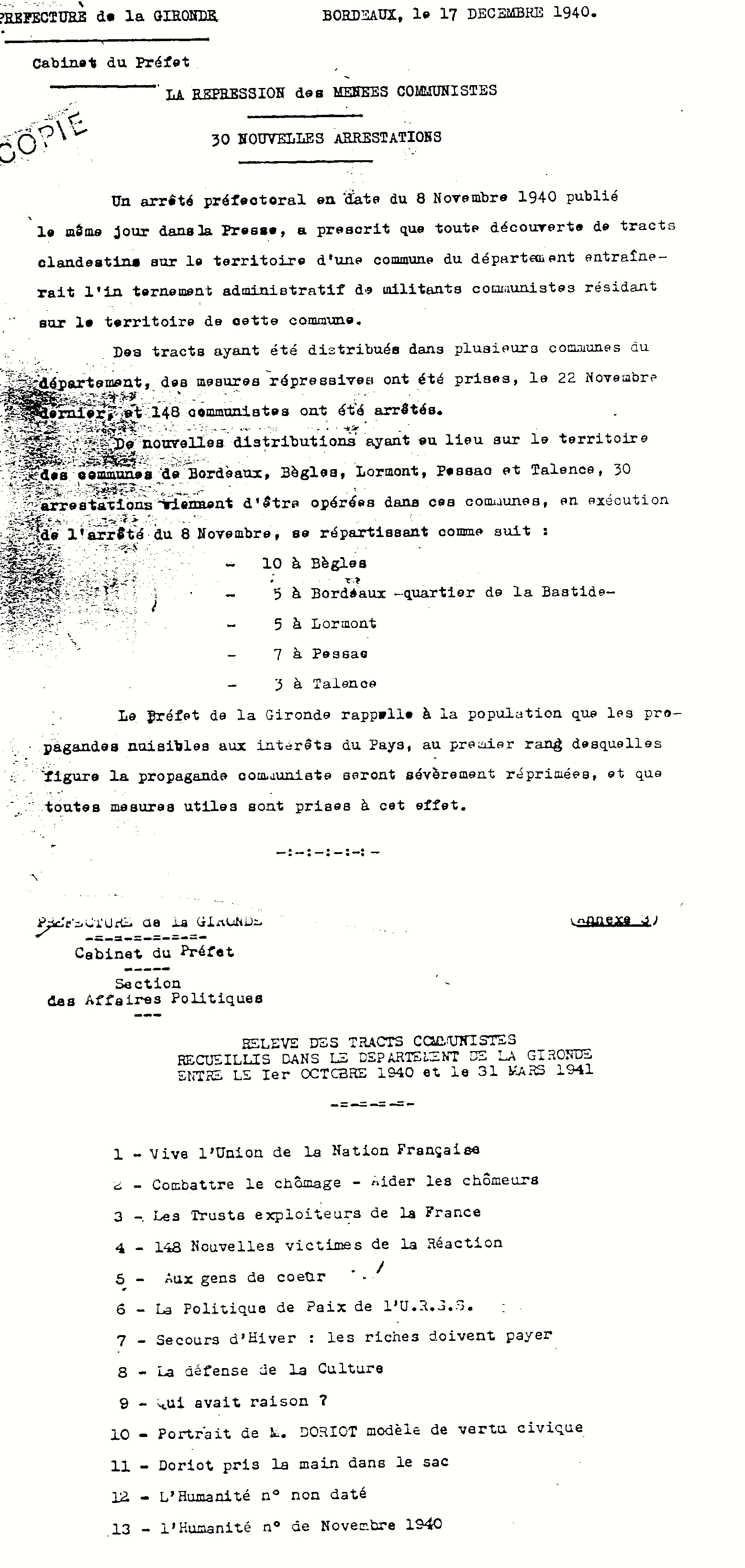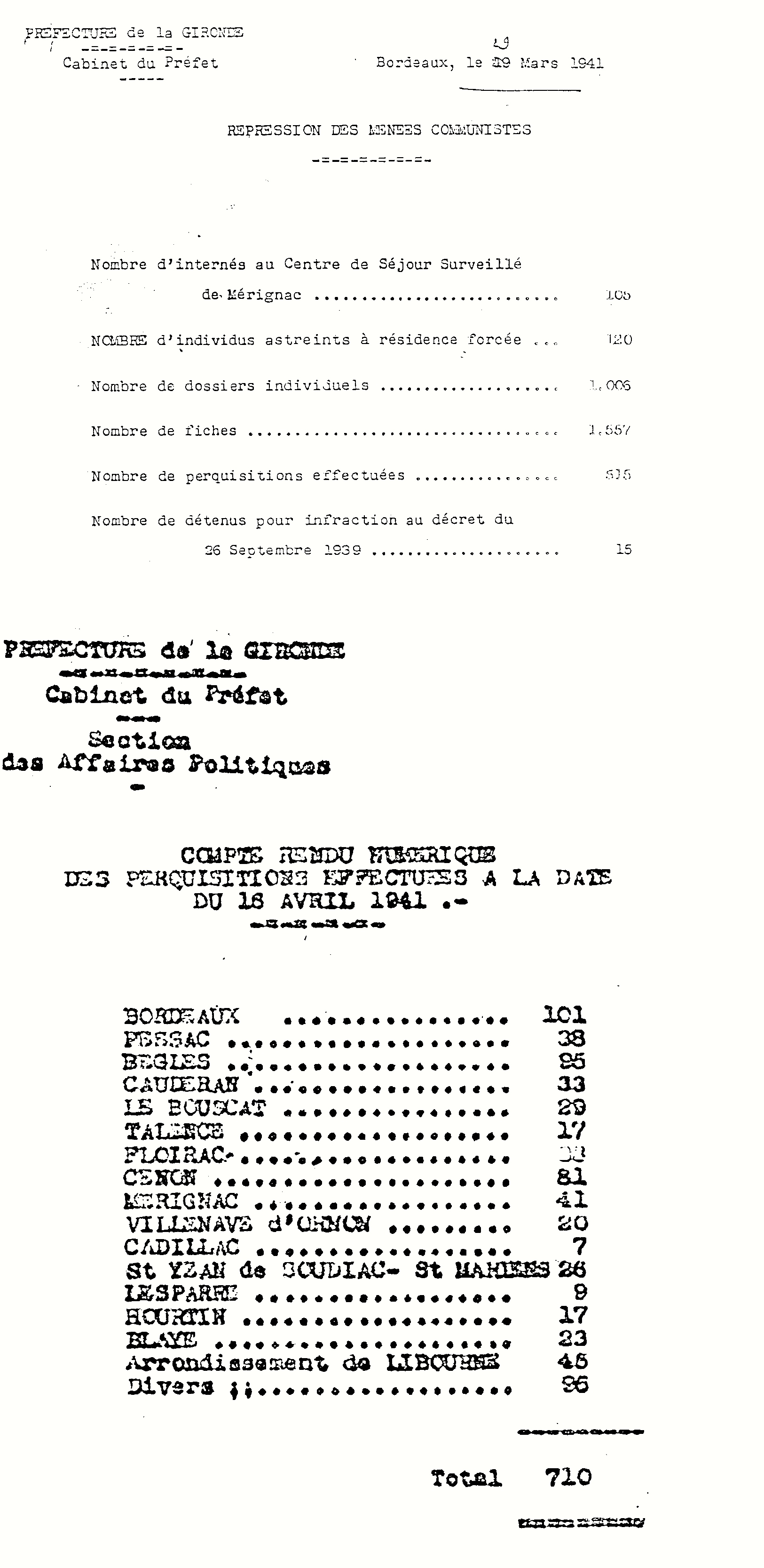 Notes du 29 mars 1941 et compte rendu des perquisitions effectuées au 15 avril-AD33