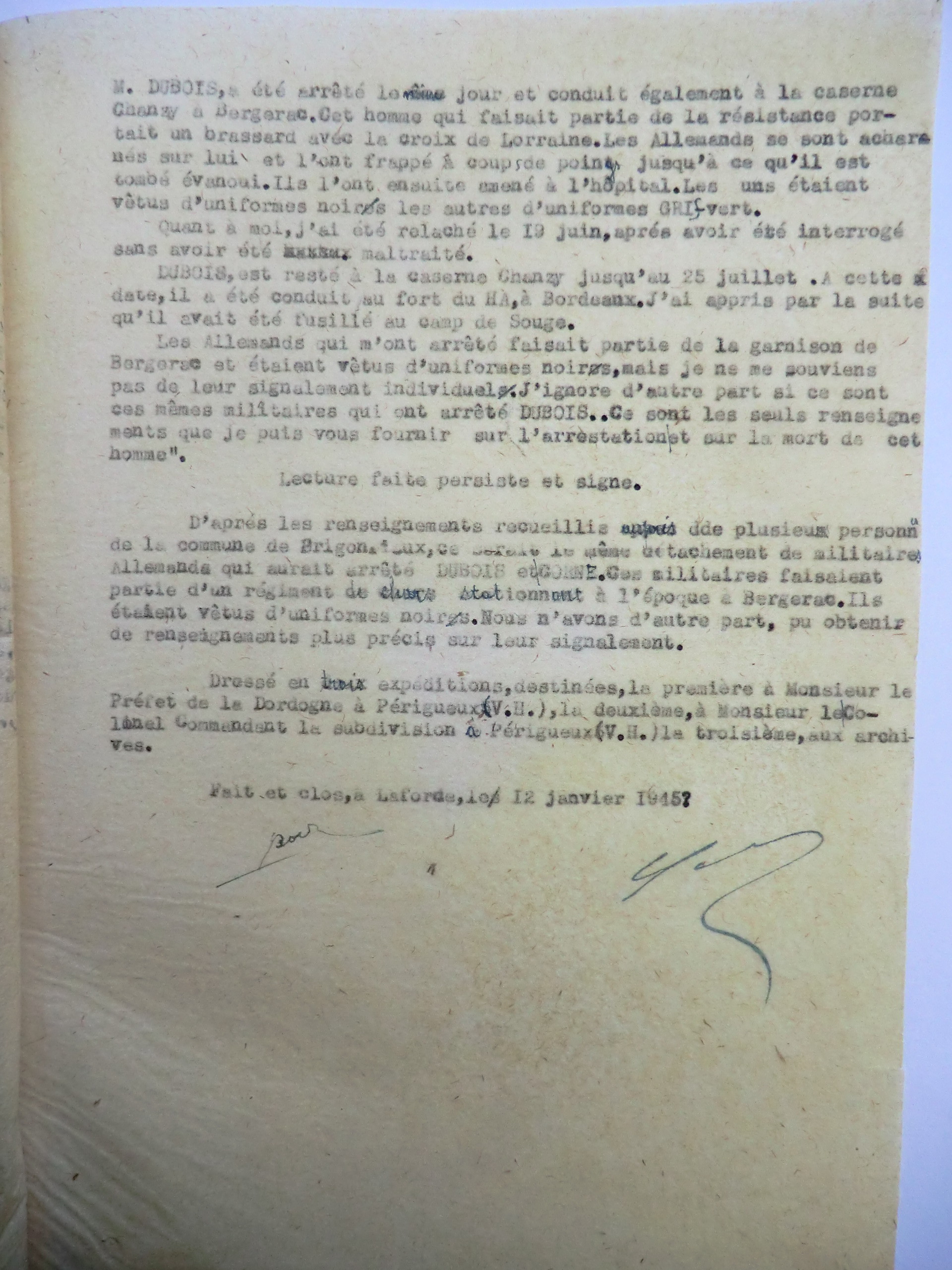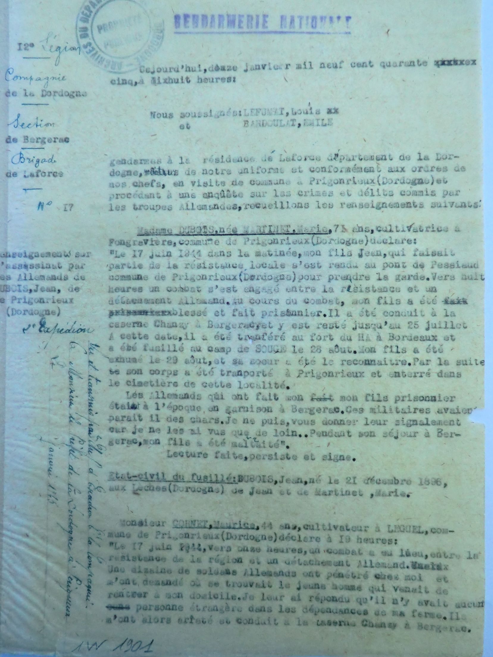 Ci-dessous les témoignages de la maman de Jean Dubois et de Monsieur Cornet enregistrés en 1950 par la gendarmerie consultés aux Archives Départementales de la Dordogne.