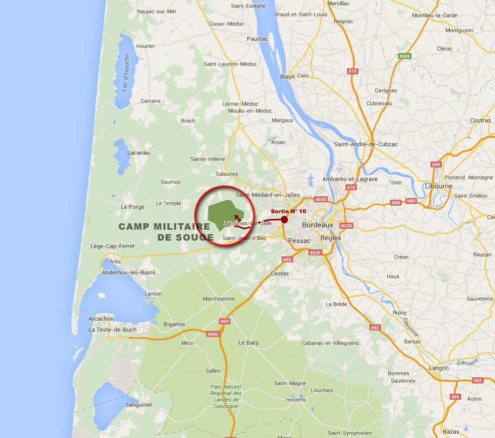 La carte ci-dessous indique la situation du camp militaire de Souge et les grands axes d’accès.