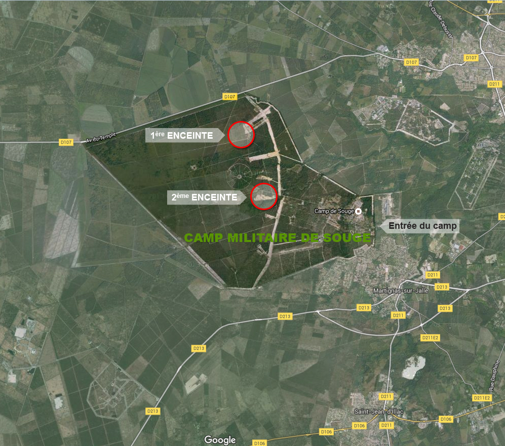 La carte ci-dessous indique les  emplacements des deux lieux, appelés enceintes sacrées ou furent fusillés les 256 de Souge.
